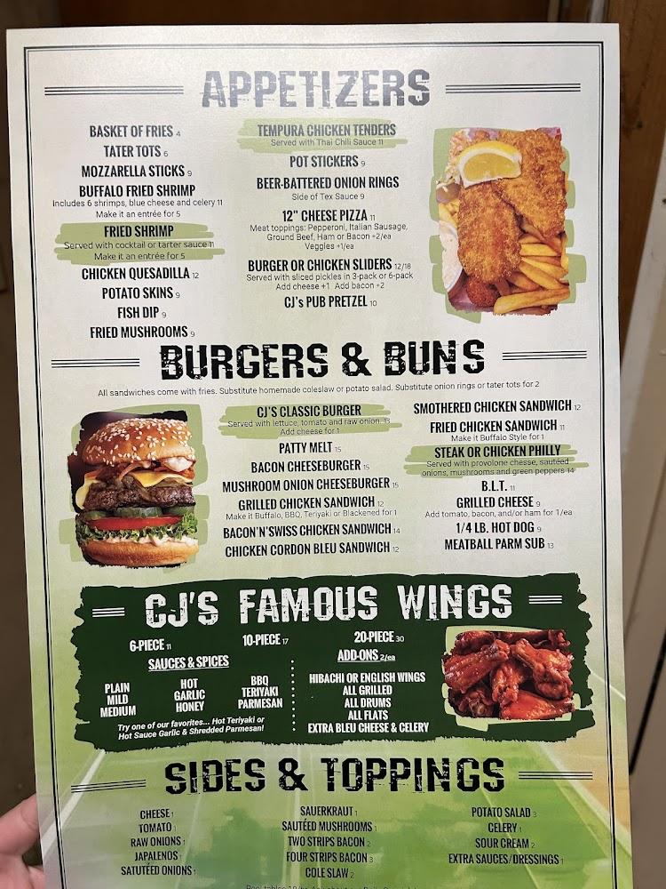 The menu at CJ's Sports Bar & Grill features a variety of American favorites. Appetizers like mozzarella sticks and buffalo shrimp offer great starts. The heartiest choices come from the burger section, with options like the classic CJ's burger and bacon cheeseburger, all reasonably priced. Those craving a spicy kick often go for the famous wings, available in different quantities. Sides are plentiful, letting diners customize their plates easily. The beverage selection, including craft beers and unique cocktails, perfectly complements the food. Overall, the menu caters to every craving, ensuring everyone leaves satisfied.
